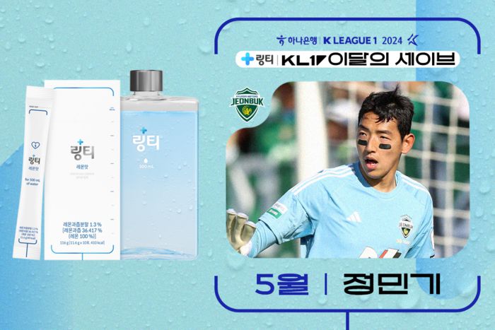 5월 ‘이달의 세이브’는 K리그1 10~15라운드 6경기를 대상으로 했고, 후보는 전북 정민기와 제주 유나이티드 김동준이었다. 이달의 세이브는 2명의 후보를 대상으로 K리그 멤버십 애플리케이션 ‘킥’(Kick)을 통한 팬 투표(80%), 링티 공식몰 투표(20%) 결과를 종합해 수상자를 정한다.
