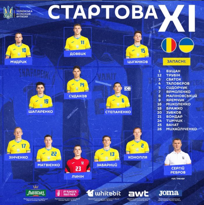 최전방에 아르템 도우비크(지로나)를 내세운 우크라이나는 2선에 볼로디미르 브라즈코(디나모 키이우), 미하일로 무드리크(첼시), 빅토르 치한코우(지로나)를 배치했다. 중원에는 타라스 스테파넨코, 발레리 본다르(이상 샤흐타르 도네츠크)가 나서고 포백에는 미콜라 마트비옌코(샤흐타르 도네츠크), 일리야 자바르니(본머스)의 중앙 수비 조합에 좌우 풀백으로 올렉산드르 진첸코(아스널), 유힘 코노플랴(샤흐타르 도네츠크)가 배치됐다. 골키퍼 장갑은 안드리 루닌(레알 마드리드)이 낀다.