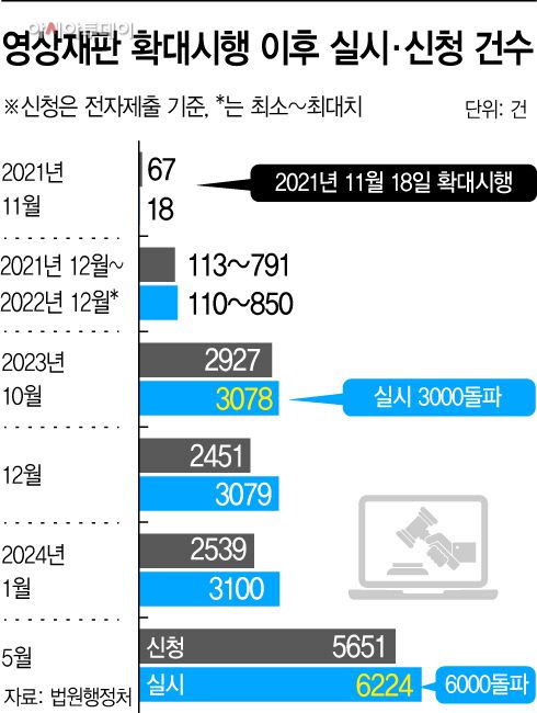 18일 아시아투데이 취재를 종합해보면 지난 5월 한 달간 영상재판 실시(영상기일 및 영상신문) 건수는 6224건으로 확대시행 이래 처음 6000건을 넘어섰다. 지난해 10월 월 3000건 이상을 기록한 이후 반년 만에 두 배로 늘어난 것이다. 특히 지난달까지 실시된 영상재판 건수는 2만1148건으로, 2023년 한 해 동안 실시된 건수인 2만4976건을 곧 넘을 전망이다.
