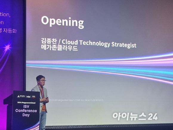 김종찬 메가존클라우드 부사장이 18일 열린 '2024 메가존클라우드 ISV 콘퍼런스 데이'에서 오프닝 연설을 하고 있다. [사진=윤소진 기자] |