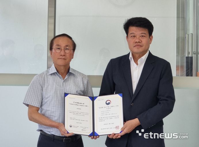 김병진 강원중기청 지역정책과장(오른쪽)이 이민세 세원상사 대표에게 글로벌 강소기업 1000+ 지정서를 전달했다. |