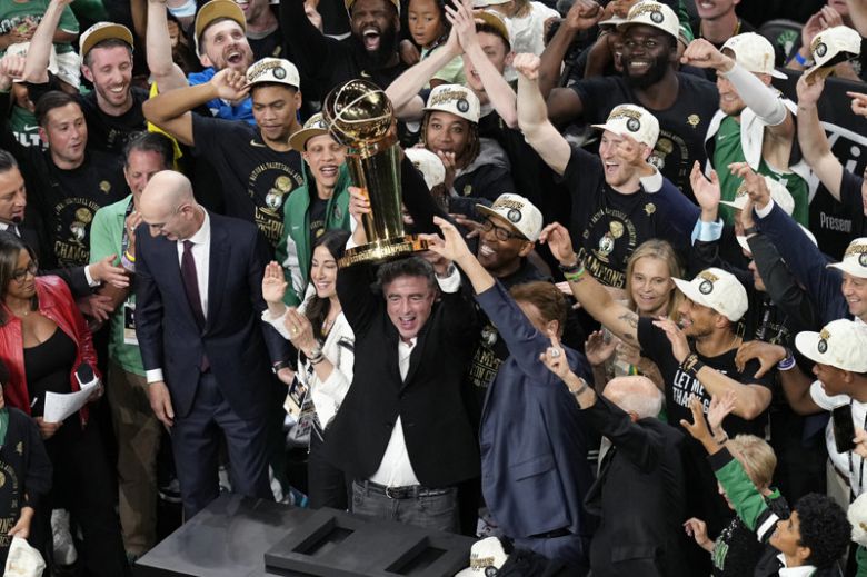 보스턴이 미국프로농구(NBA) 18번째 정상을 차지한 18일 윅 그로스벡 구단주(가운데)가 우승 트로피를 들어 올리고 있다. 2002년 구단을 인수한 그로스벡 구단주에게는 2007∼2008시즌에 이은 두 번째 우승이다. 2020∼2021시즌 밀워키에서 우승한 즈루 홀리데이를 제외한 나머지 보스턴 선수들은 모두 데뷔 첫 우승이었다. 보스턴=AP 뉴시스 |