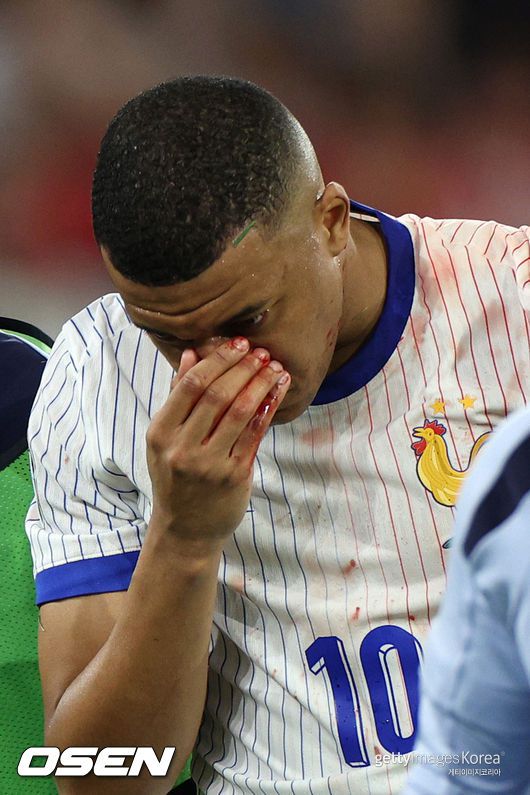 하지만 프랑스는 승리에도 마음껏 웃지 못했다. '캡틴' 음바페가 코뼈가 골절되는 큰 부상을 입었기 때문. 그는 후반 40분 프리킥 상황에서 상대 수비 케빈 단소와 공중볼을 놓고 다투다가 강하게 충돌했다. 단소 어깨에 코를 부딪힌 음바페는 하얀 유니폼이 붉게 얼룩질 정도로 피를 흘렸다.