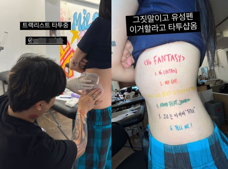 그러나 "거짓말이고 유성펜. 이거 하려고 타투샵 옴"이라며 완성된 유성펜 타투를 보여줬다. 이영지의 몸에는 새로운 앨범 '16 FANTASY'의 6곡이 전부 적혀 있어 눈길을 끌었다.