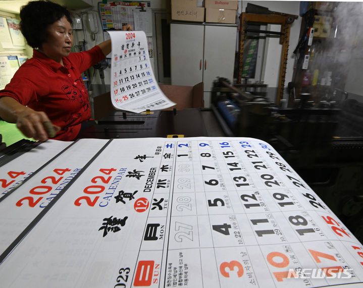 [수원=뉴시스] 김종택기자 = 2일 경기도 수원시 장안구 한 달력 인쇄소에서 직원이 '2024년 갑진년' 달력을 제작하고 있다. 2023.11.02. jtk@newsis.com |