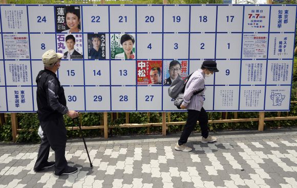 도쿄 시민들이 20일 다가오는 도쿄 도지사 선거에 출마하는 후보자들의 캠페인 포스터가 전시된 게시판을 지나고 있다. 2024.6.20 도쿄 EPA 연합뉴스 |
