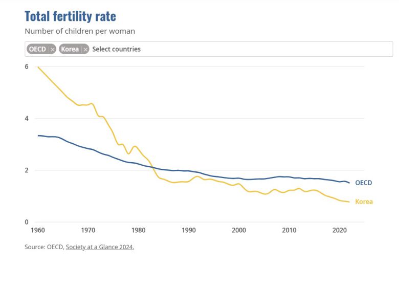 같은 기간 한국은 6명에서 0.78명으로 낮아져 거의 8분의 1로 급락했다. 2022년 기준 OECD 회원국 중 최하위이기도 하다.