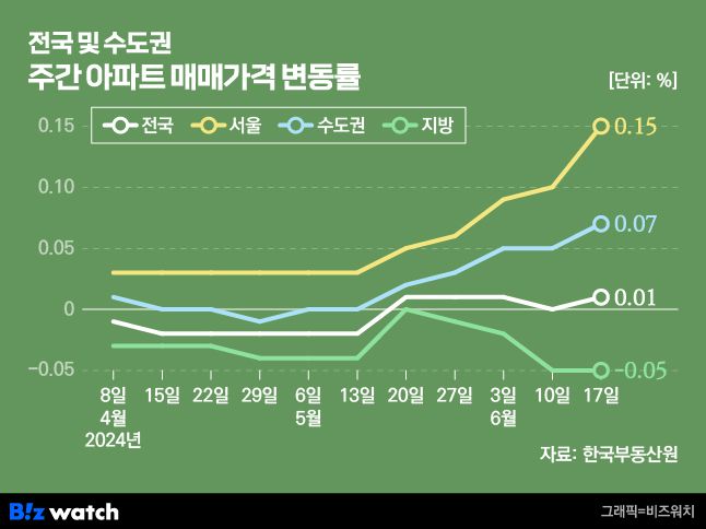 한국부동산원에 따르면 6월 셋째주(17일 기준) 전국 아파트 매매가격지수 변동률은 0.01%로 지난주(0%) 대비 상승 전환했어요. 수도권(0.05%→0.07%)과 서울(0.10%→0.15%)은 상승폭이 커졌고 지방(-0.05%)은 하락폭을 유지했네요.