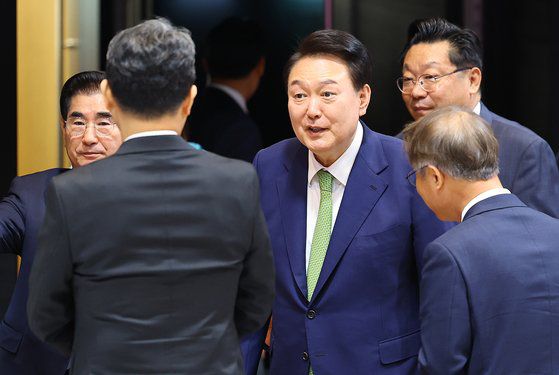 윤석열 대통령이 19일 경기도 성남시 HD현대 글로벌R&D센터 아산홀에서 '저출생 추세 반전을 위한 대책'을 주제로 열린 2024년 저출산고령사회위원회 회의에 입장하며 이주호 사회부총리 겸 교육부 장관 등 참석자와 인사하고 있다. 대통령실통신사진기자단 |