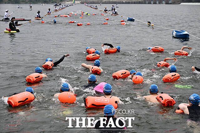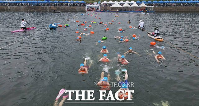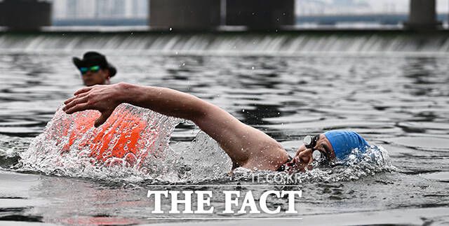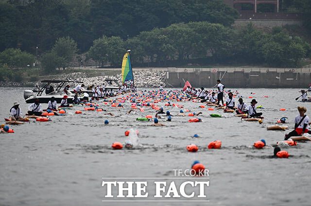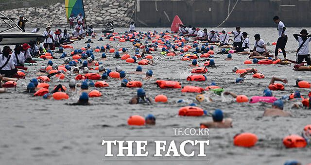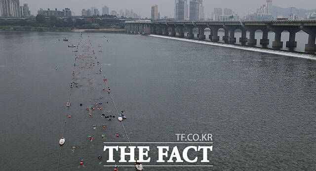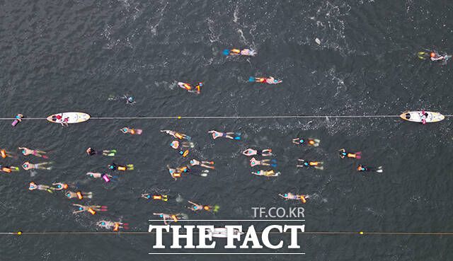 [더팩트ㅣ박헌우 기자] '2024 한강 크로스 스위밍 챌린지'가 22일 오전 서울 송파구 잠실대교 남단에서 열린 가운데 대회 참가자들이 한강을 건너고 있다.