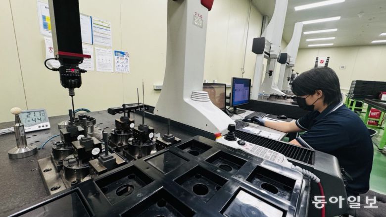 21일 경북 구미시 진평동에 있는 주광정밀 내 첨단 기술실에서 직원이 3차원(3D) 측정기로 흑연 가공 제품을 최종 검사하고 있다. 이 공정은 품질 보증뿐만 아니라 고객사 만족도까지 높이고 있다. 구미=장영훈 기자 jang@donga.com |