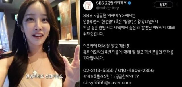지난 25일 SBS '궁금한 이야기Y' 측은 공식 계정에 "인플루언서 '한선월'(혹은 '청월')로 활동했으나 이달 중순 인천 서구 자택에서 숨진 채 발견된 이모씨에 대해 취재 중입니다. 이모씨에 대해 잘 알고 계신 분 혹은 이모씨의 주변 인물에 대해 잘 알고 계신 분들의 연락을 기다립니다"라는 글을 게재했다.