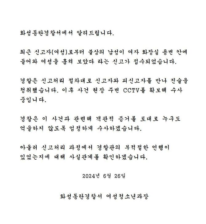 경찰서는 “최근 여성 신고자로부터 불상의 남성이 여자화장실 용변 칸에 들어와 여성을 훔쳐봤다는 신고가 접수됐다”며 “경찰은 신고 처리 절차대로 신고자와 피신고자를 만나 진술을 청취했고 현장 주변 CCTV를 확보해 수사 중”이라고 밝혔다.