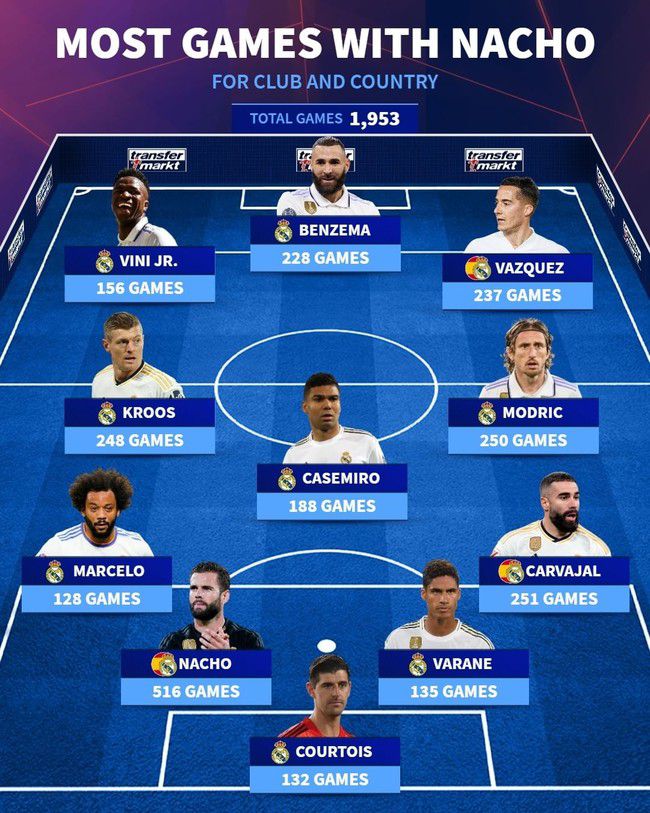 축구 통계 매체 '트랜스퍼마크트'는 26일(한국시간) 공식 SNS를 통해 "나초가 레알 마드리드의 한 시대를 마무리한다"라며 나초와 함께 많은 경기를 소화한 선수들로 구성한 베스트11을 공개했다.