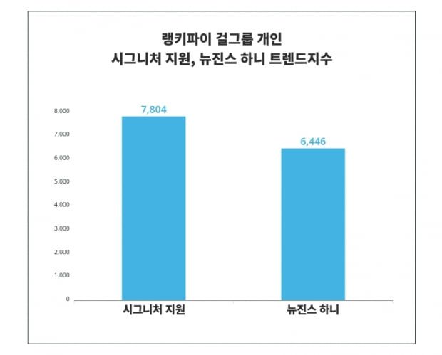 랭키파이의 6월 4주차 걸그룹 개인 분석에 따르면, 시그니처 지원이 ‘7,804포인트’로 리드 하고 있으며, 뉴진스 하니가 ‘6,446포인트’로 그 뒤를 이었다. 두 트렌드 사이의 트렌드지수 차는 ‘1,358포인트’로 집계되었다.