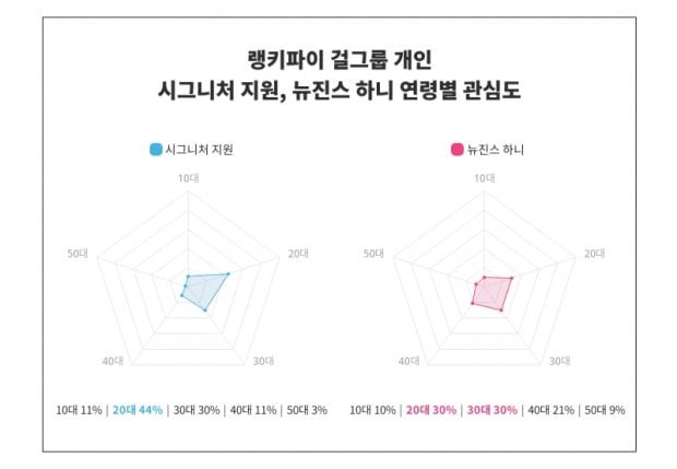 연령별 관심도 조사에서 시그니처 지원과 뉴진스 하니의 관심도가 다양한 연령층 사이에서 어떻게 분포되어 있는지 명확히 드러났다. 조사 결과, 시그니처 지원은 특히 20대에서 44%의 높은 관심도를 기록하며 가장 큰 관심을 끌고 있는 것으로 나타났다. 시그니처 지원의 인기는 10대 11%, 20대 44%, 30대 30%, 40대 11%, 50대 3%순으로 이어지며, 각 연령대별에서 어떠한 관심을 받고 있는지가 조사되었다.