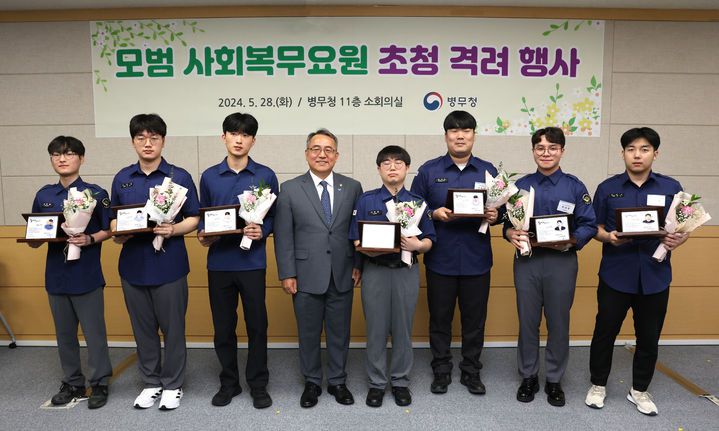 [서울=뉴시스] 김종철 병무청장(왼쪽에서 네 번째)이 28일 정부대전청사에서 모범 사회복무요원 격려 행사 후 기념촬영을 하고 있다. (사진=병무청 제공) 2024.05.28. photo@newsis.com *재판매 및 DB 금지
