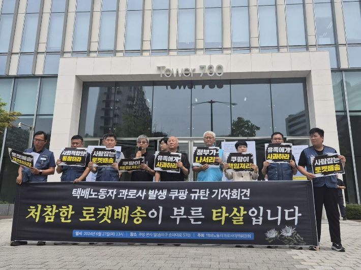 택배노동자과로사대책위원회(대책위)와 유가족은 27일 서울 송파구 쿠팡 본사 앞에서 '처참한 로켓배송이 부른 택배노동자의 과로사, 쿠팡 규탄' 기자회견을 열고 "쿠팡CLS 남양주2캠프 G대리점에서 일했던 고인이 과로로 사망했다"고 주장했다.