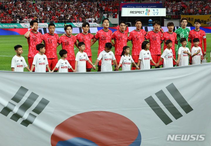 [서울=뉴시스] 황준선 기자 = 대한민국 축구 국가대표팀 선수들이 지난 11일 오후 서울 마포구 서울월드컵경기장에서 열린 2026 국제축구연맹(FIFA) 북중미 월드컵 아시아 지역 2차 예선 조별리그 C조 6차전 한국과 중국의 경기 시작 전 애국가를 부르고 있다. 2024.06.11. hwang@newsis.com