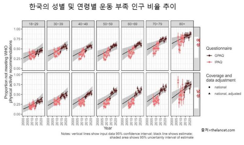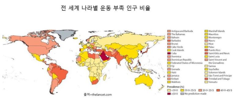 특히 한국은 운동 부족 인구 비율이 58.1%로 세계 최상위권에 속했다. 아랍에미리트, 쿠웨이트, 쿠바, 레바논에 이어 세계 5위였다. 남성이 55.9%, 여성이 60.3%로 여성의 운동 부족 상태가 더 심하다.