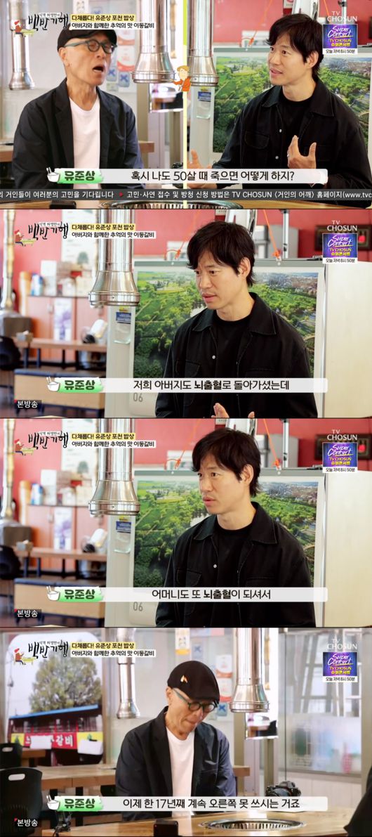 [OSEN=박근희 기자] '식객 허영만의 백반기행’ 유준상이 뇌출혈로 사망한 아버지와, 17년째 마비중인 어머니를 언급하며 몸관리를 철저히 한다고 밝혔다.