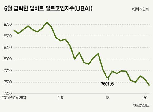 비트코인 현물 ETF와 함께 기지개를 켰던 디지털자산(코인) 시장이 6월 들어 다시금 움츠러드는 모양새다. 6월 27일 기준 비트코인 가격은 약 6만1000달러다. 7만1000달러에 육박했던 6월 초와 비교하면 15% 이상 떨어진 가격이다. 비트코인뿐 아니다. 비트코인을 제외한 다른 모든 코인 시가총액 합은 올해 3월 1조3000억달러에서 최근 1조달러 수준까지 쪼그라들었다.