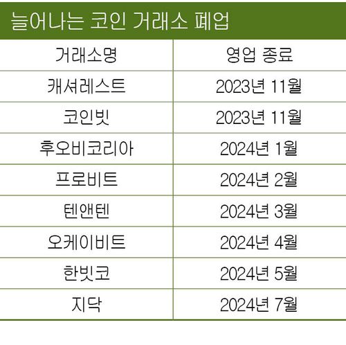 코인 상폐와 별개로 최근 ‘거래소 줄폐업’도 투자자 입장에서는 단기 리스크다. 올해 1월 초 후오비코리아에 이어 2월에는 프로비트, 4월 오케이비트, 5월 한빗코, 6월 지닥 등 굵직한 중소 거래소가 연이어 영업 종료를 알렸다. 여기도 가상자산법이 한몫했다는 평가가 많다. 코인 투자 혹한기 ‘크립토 윈터’가 길어진 데다 5대 원화마켓 거래소로 쏠림 현상, 여기에 가상자산법 시행으로 강화될 규제·감독을 사업자들이 견뎌내지 못했다는 설명이다. 거래소 자금 반환을 둘러싸고 투자자 사이에서 여러 잡음이 터져 나오고 있는 실정이다.