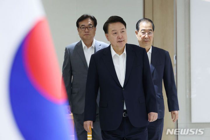 [서울=뉴시스] 조수정 기자 = 윤석열 대통령과 정진석 비서실장, 한덕수 국무총리가 2일 서울 용산 대통령실 청사에서 열린 국무회의에 입장하고 있다. 2024.07.02. chocrystal@newsis.com