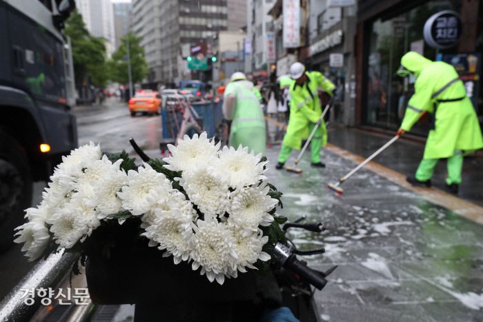 국화꽃으로 추모 서울 시청역 교차로 차량 돌진 사고 이튿날인 2일 사고 현장에 놓인 국화꽃 너머에서 구청 관계자들이 현장 정리를 하고 있다. 정효진 기자 hoho@kyunghyang.com |