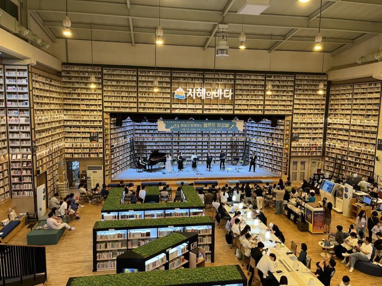 경남 창원시 ‘마산지혜의바다’ 도서관에서 지난달 8일 열린 플루트 공연을 주민과 학생들이 관람하고 있다. 마산지혜의바다 도서관은 폐교를 활용한 도시재생 프로젝트로 탄생한 복합독서문화공간이다. 경남도교육청 제공 |