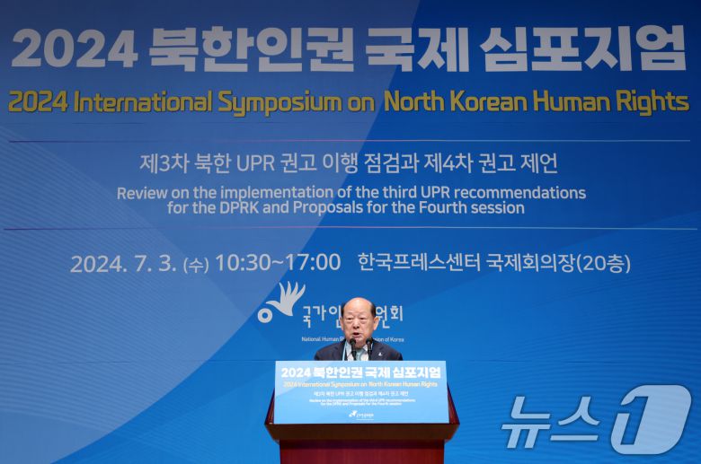 (서울=뉴스1) 박정호 기자 = 송두환 국가인권위원회 위원장이 3일 오전 서울 중구 세종대로 한국프레스센터 국제회의장에서 제3차 북한 UPR 권고 이행 점검과 제4차 권고 제언을 주제로 열린 2024 북한인권 국제 심포지엄에서 개회사를 하고 있다. 2024.7.3/뉴스1