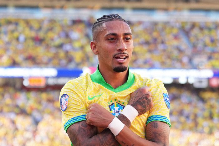 브라질 축구 대표팀의 하피냐가 3일(한국시각) 미국 샌타클래라에서 열린 2024 코파아메리카 조별리그 콜롬비아와 3차전에서 선제골을 넣은 뒤 기뻐하고 있다. 샌타클래라/AFP 연합뉴스 |