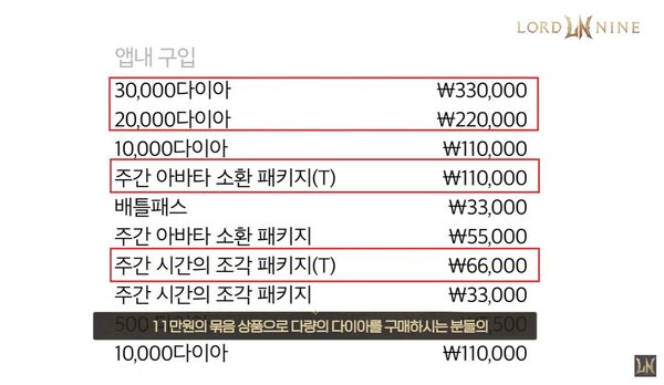 3만 다이아 '33만원', 주간 아바타 소환 패키지 '5만5000원', 주간 시간의 조각 패키지 '3만 3000원', 배틀 패스 '3만 3000원' 등의 인앱 상품들의 구성과 가격이 노출됐고, 해당 내용들이 파장을 불러 일으켰다.