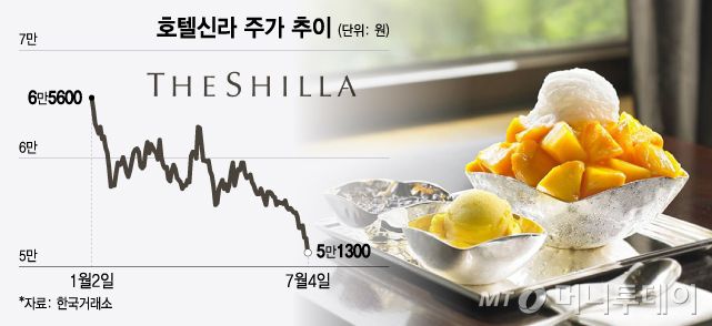 4일 코스피 시장에서 호텔신라 주가는 전일 대비 1300원(2.47%) 내린 5만1300원에 거래를 마쳤다. 이날 장중 5만1000원까지 떨어지며 52주 최저가를 갈아치웠다. 올해 들어 21% 하락했다. 지난해 여름(2023년 8월28일) 기록한 52주 최고가(9만4000)원에 비해서는 45% 내린 주가다. 하락세인 주가를 두고 '이제는 호텔신라 주식 2주를 팔아야 겨우 신라호텔 망고빙수(10만원 수준) 하나를 살 수 있다'는 우스갯소리가 나오는 이유다.