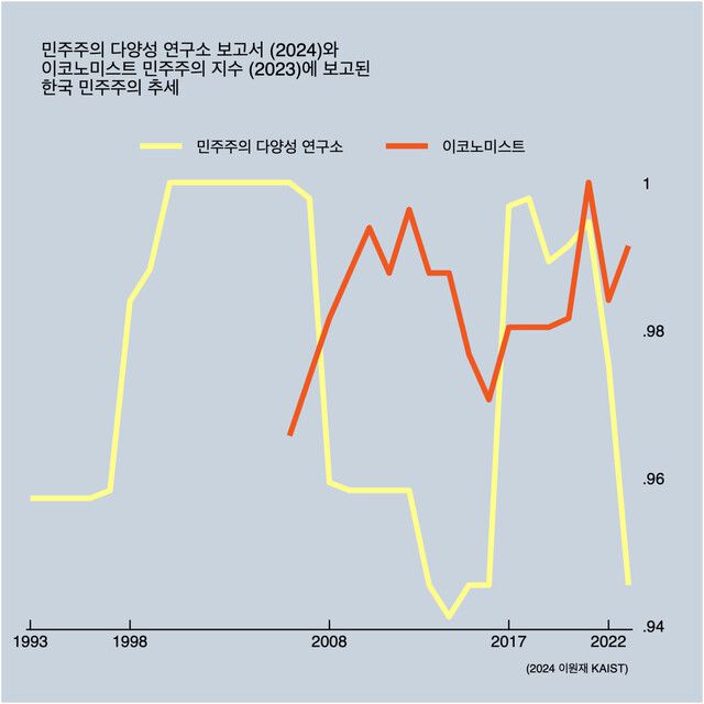 그러나 이 연구소 보고서의 높은 가치에도 불구하고, 몇 가지 문제를 제기하지 않을 수 없다. 민주주의 다양성 연구소는 국가별로 25명가량의 정치학자, 언론인, 시민운동가를 섭외하여 조사한다. 반면 비슷한 성격의 ‘이코노미스트’의 민주주의 조사는 일반인 조사 데이터를 쓴다. 조사 결과를 지난 30년으로 확장하면, 민주주의 다양성 연구소는 한국의 민주주의 점수를 국민의힘 계열 정권엔 항상 낮게, 민주당 계열 정권엔 항상 높게 평가하는 경향이 있다. ‘이코노미스트’ 조사에서는 부침이 있을지언정, 한국 민주주의가 정권에 상관없이 향상해온 것으로 나타난다. 일반인 대상 조사가 항상 우월할 수는 없고, 현 정부의 성평등에 대한 공격과 언론 자유 위축을 주요 이유로 꼽긴 했지만 ‘추-윤 갈등’을 윤 대통령의 권력남용 성향 사례로 지목한 것을 보면 민주주의 다양성 연구소 전문가 패널의 정치적 편향을 의심하지 않을 수 없다.