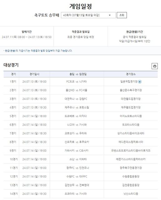 ◆ 축구토토 승무패 43회차 대상 경기