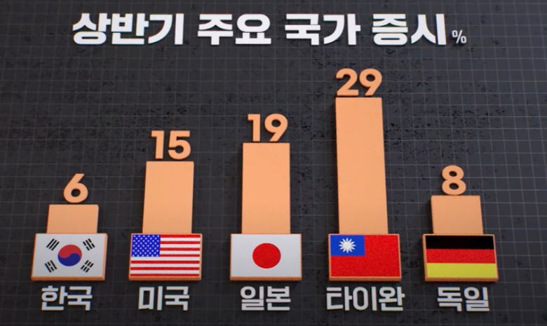 지난 상반기도 '코리아 디스카운트'는 여전했습니다. 미국과 일본 증시는 지난해에 이어 지난 상반기에도 두 자릿수 상승률을 기록했고, 특히 타이완 증시는 30%에 육박하는 수익률을 거뒀습니다. 그러나 국내 증시는 고작 6% 오르는데 그쳤습니다.