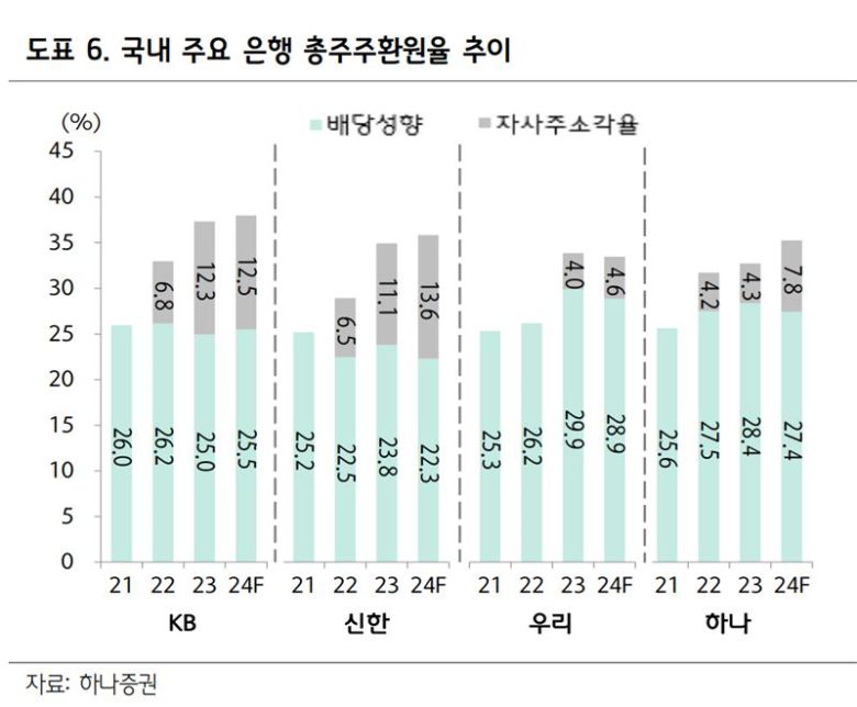 주주에 대한 수익 환원은 크게 배당과 자사주 소각으로 나뉩니다. 두 비중을 합한 걸 총주주환원율(배당성향 + 자사주 소각율)이라고 하죠. 총주주환원율이 50%라면 순이익의 절반을 주주들에게 돌려준다는 뜻입니다. 과거 국내 은행들의 총주주환원율은 20% 대에 머물다가 재작년 30%를 훌쩍 넘더니 계속 우상향하고 있습니다.