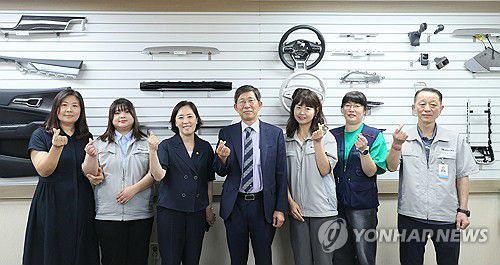 (서울=연합뉴스) 신영숙 여성가족부 차관(왼쪽 세 번째)이 8일 오후 새일여성인턴 참여기업인 경기 시흥시 대양프라텍을 방문해 기업관계자 및 인턴 사업 참여자들과 기념 촬영하고 있다. 2024.7.8 [여성가족부 제공. 재판매 및 DB 금지]