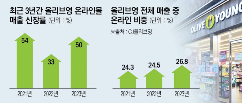 이에 올리브영 온라인몰의 최근 3년간 매출은 전년 동기 대비 기준 △2021년 54% △2022년 33% △2023년 50% 각각 증가했다. 전체 매출 중 오프라인 대비 온라인이 차지하는 비중도 커지고 있다.
