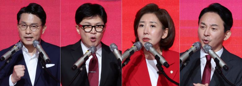 나경원 후보는 한·원 후보를 모두 겨냥해 “줄 세우고 줄 서는 정치망령이 떠돈다”고 비판했다. 윤상현 후보도 “우리 당을 폭망하게 만드는 것이 썩은 기득권의 줄세우기와 계파정치”라고 지적했다.