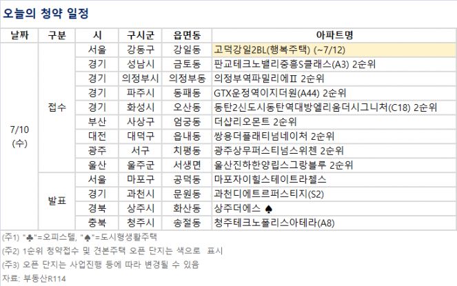 부동산 정보업체 부동산R114에 따르면 10일인 오늘은 서울 강동구 '고덕강일2BL(행복주택)'에서 1순위 청약을 받는다.