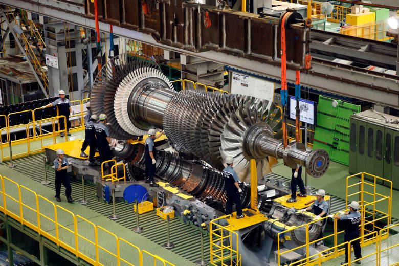 두산에너빌리티는 한국남부발전과 안동복합발전소 2호기 가스터빈에 대한 장기 유지보수 서비스 계약을 체결했다고 10일 밝혔다. 사진은 대형 가스터빈 최종조립 작업./두산에너빌리티 제공