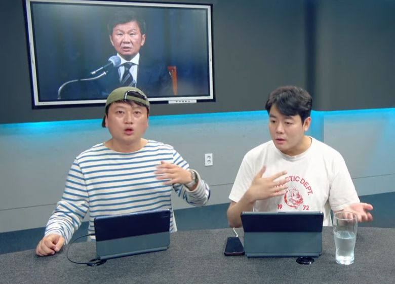 박문성 축구 해설위원(왼쪽)이 박주호 대한축구협회 전력강화위원에 법적 대응을 시사한 축협을 비판하고 있다. [유튜브 '달수네 라이브' 영상 캡처] |