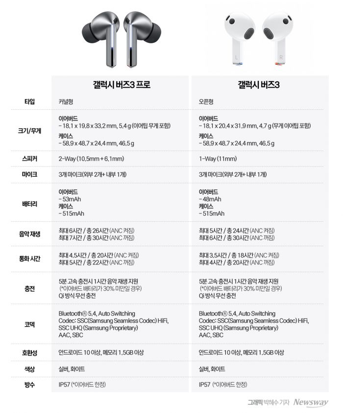 갤럭시 버즈3 시리즈는 실버와 화이트 두 가지 색상으로 출시된다. 그래픽=박혜수 기자 |