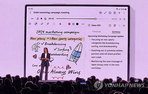 (파리=연합뉴스) 송진원 기자 = 10일 프랑스 파리 루브르 박물관에서 열린 갤럭시 언팩 2024에서 '갤럭시 Z 폴드6'와 '갤럭시 Z 플립6'에 탑재된 '구글 제미나이' 앱이 공개되고 있다. 2024.7.10