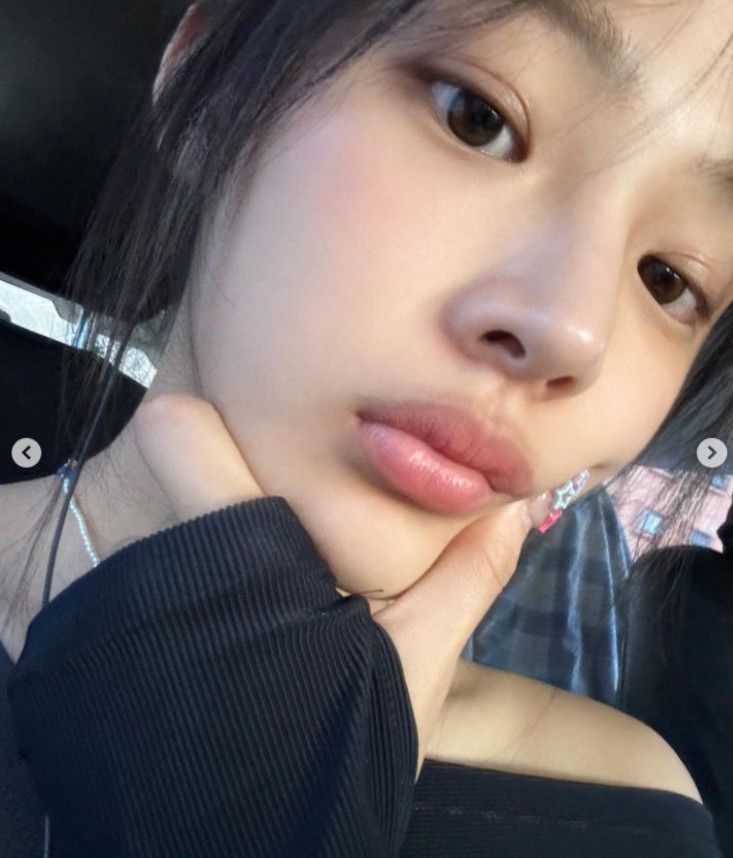 사진 속에는 민지가 이동하는 차 안에서 얼굴 가까이에 카메라를 대고 셀카를 남기고 있다. 근접 셀카에서도 굴욕 없는 도자기 피부가 민지의 미모를 더욱 돋보이게 만든다.
