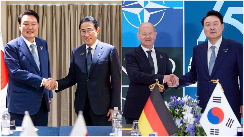 나토 정상회의 참석 중인 윤석열 대통령이 10일(현지 시각) 미국 워싱턴 DC의 한 호텔에 열린 한일 정상회담에서 기시다 후미오 일본 총리와 악수를 하며 기념 촬영을 하고 있다(왼쪽 사진). 윤 대통령은 이에 앞서 열린 한독 정상회담에선 올라프 숄츠 독일 총리를 만나 독일의 유엔사령부 가입을 환영한다는 뜻을 전했다./연합뉴스 |