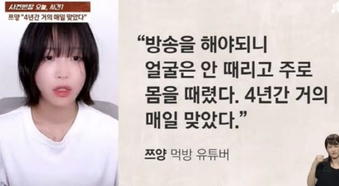 유흥업소를 그만두겠다고 한 뒤 유튜브를 하게 됐다는 쯔양은 “얼굴은 티 난다고 몸을 때린다거나 잘못 몇 번 얼굴에 맞아서 그대로 방송을 한 적도 있다, 그때 그런 모습을 보인 적도 있었고 처음 방송할 때 벌었던 돈은 전부 가져갔다, 그 당시에 방송으로 그래도 좀 벌었었는데 치킨 시켜 먹을 돈이 없어서 방송할 때 먹을 치킨도 못 시키고 그랬다”고 말했다.