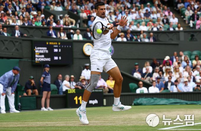 [런던 로이터=뉴스핌] 장환수 스포츠전문기자= 노바크 조코비치가 13일 끝난 윔블던 남자 단식 준결승에서 로렌초 무세티에게 강력한 포핸드 스트로크를 날리고 있다. 2024.07.13 zangpabo@newspim.com